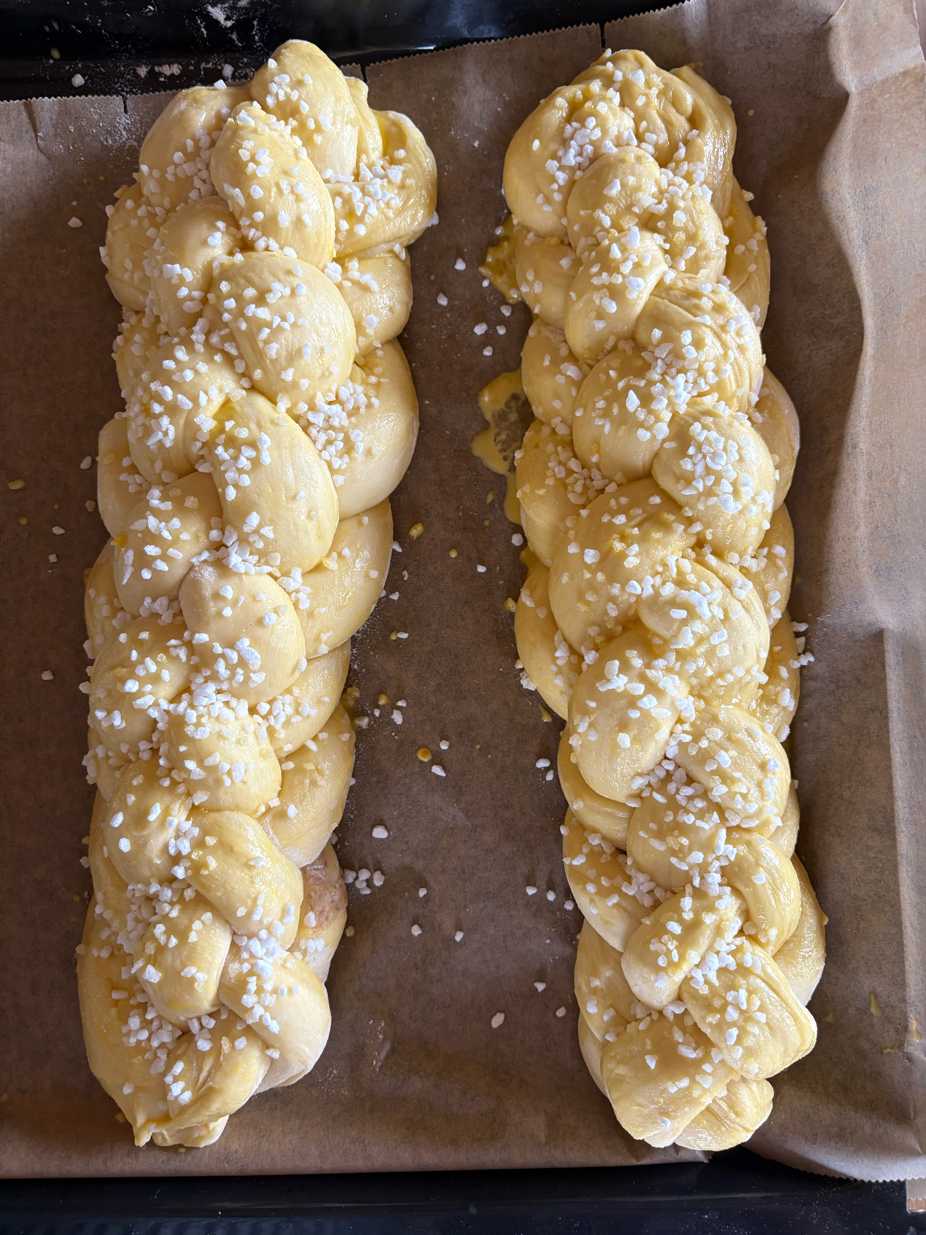 Alle Zutaten auf Raumtemperatur bringen und in der Küchenmaschine 10 Minuten zu einem homogenen Germteig verarbeiten. Den Teig 60 Minuten ruhen lassen und zu zwei großen oder mehreren kleinen Striezeln formen. Die Striezel auf ein mit Backpapier belegtes Backblech legen, mit einem Küchentuch abdecken und nochmals 30-60 Minuten gehen lassen. Anschließend mit einem verquirlten Ei bepinseln und nach Belieben mit Hagelzucker bestreuen.