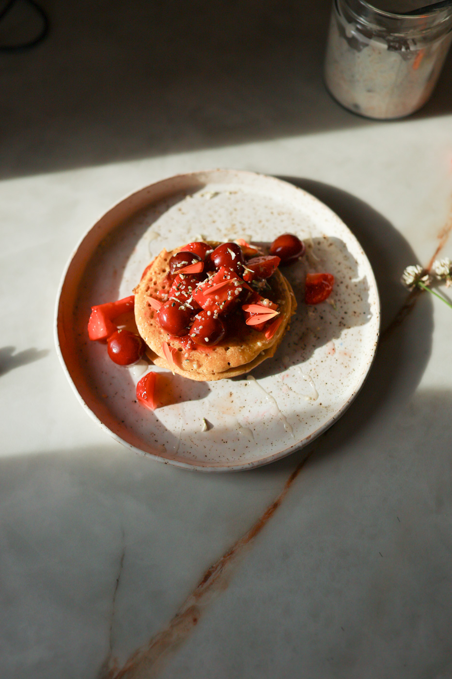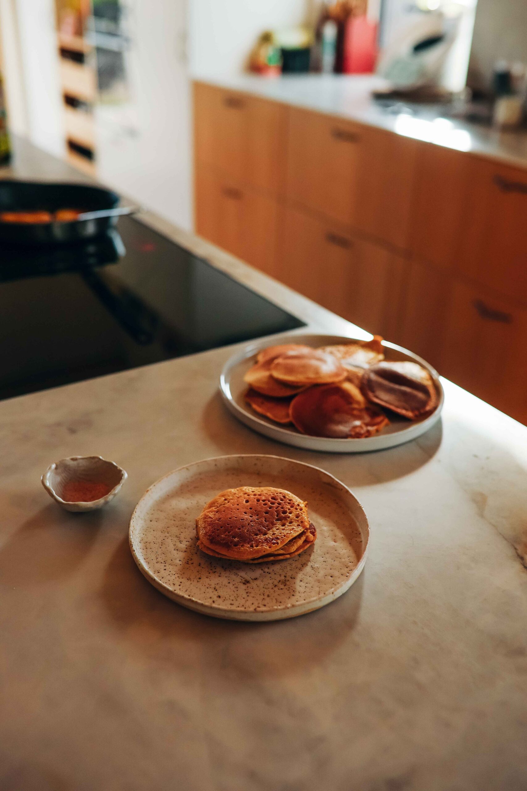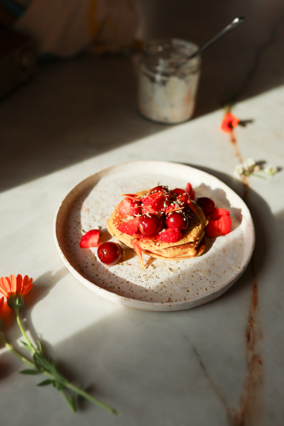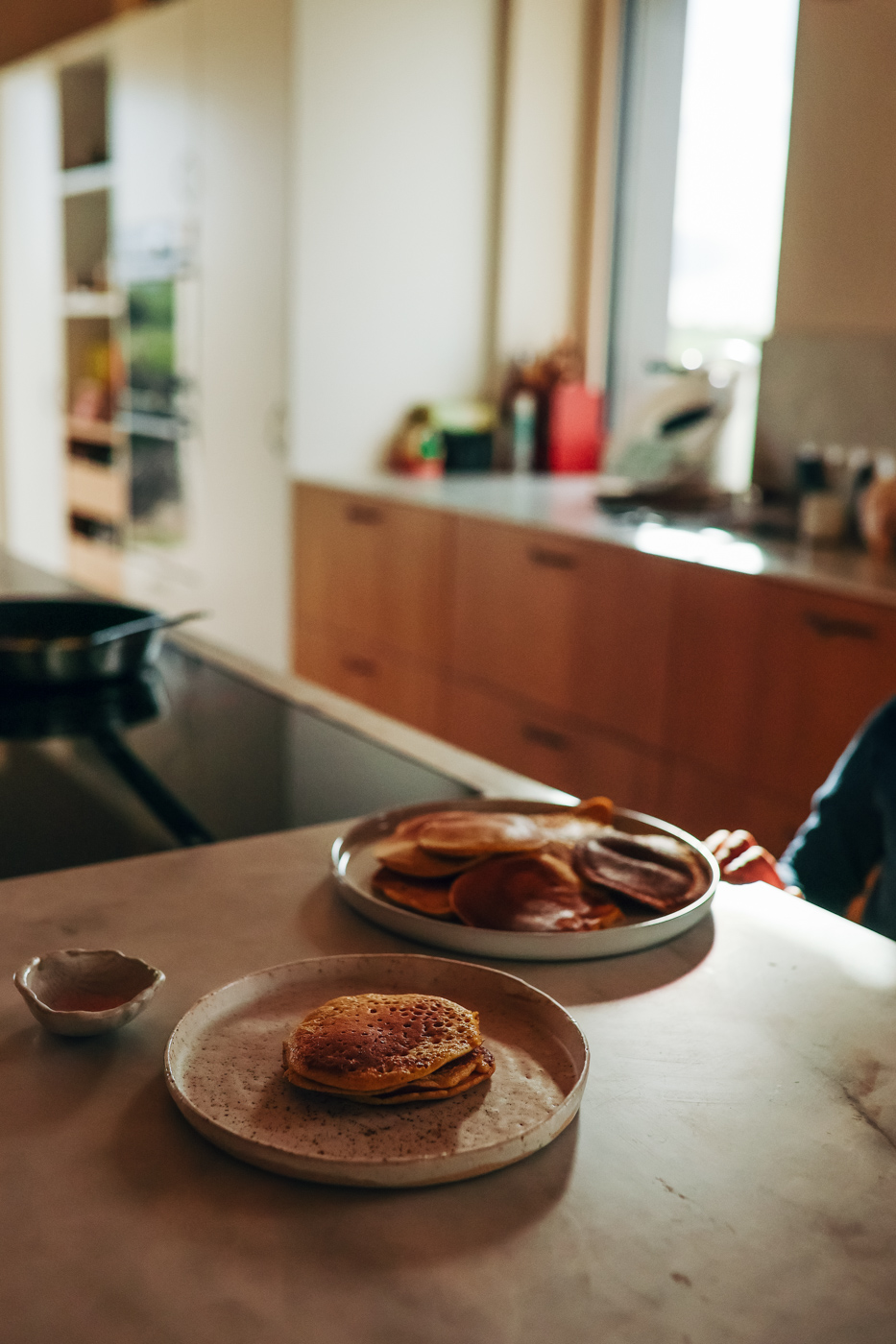 Deshalb wird der Ofen gerade auch gar nicht ausgeschalten und bevor wir uns an die Pasta machen, gibts erstmal eine runde Pancakes mit Honig, frischen Kirschen vom Baum und Erdbeeren aus dem Gemüsegarten. Richtig nährend und super vom Geschmack mit hausgemachtem Kefir und frisch gemahlenem Einkornmehl.